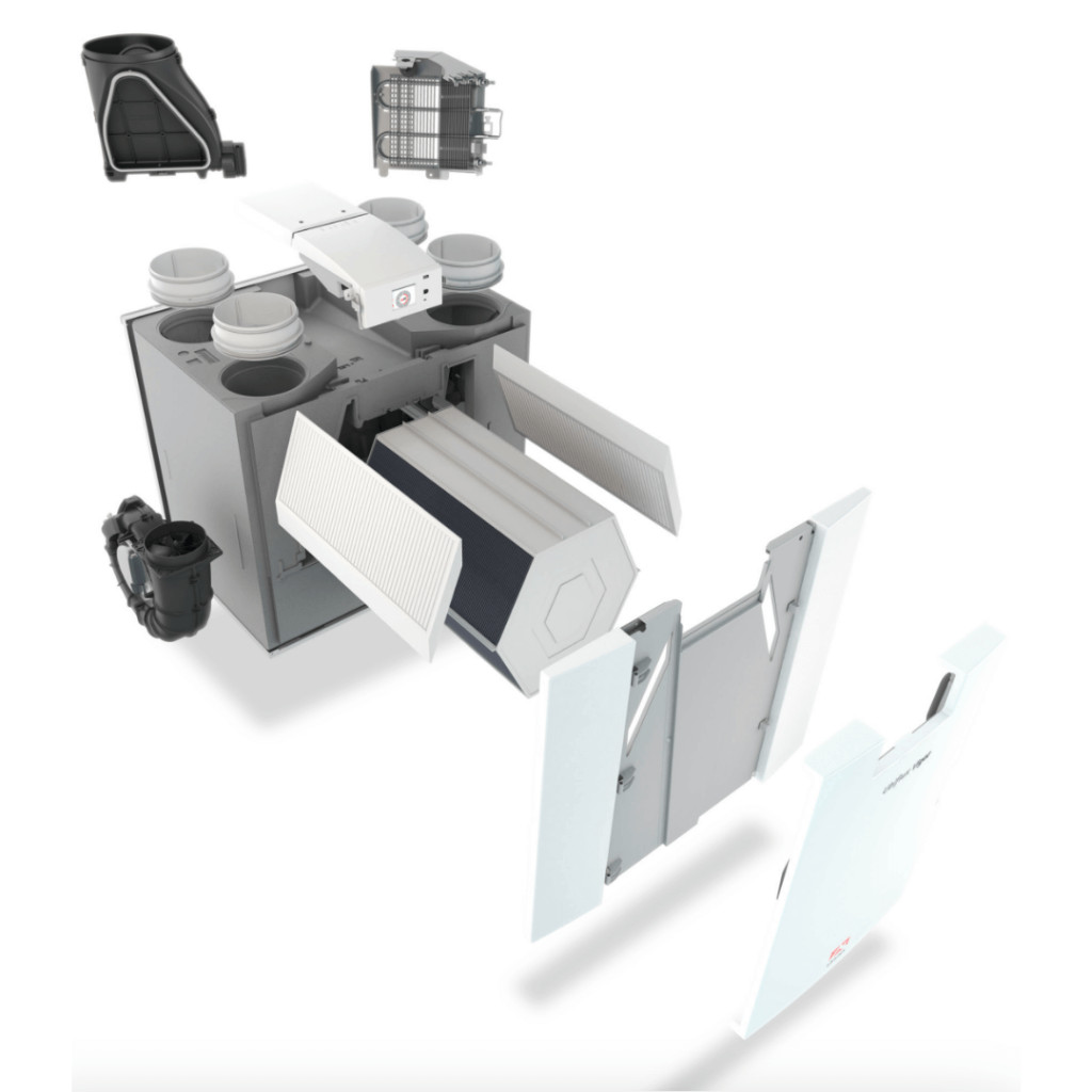 Hőcserélő típusa: Kereszt-ellenáramú, műanyag, tisztítható hőcserélő.